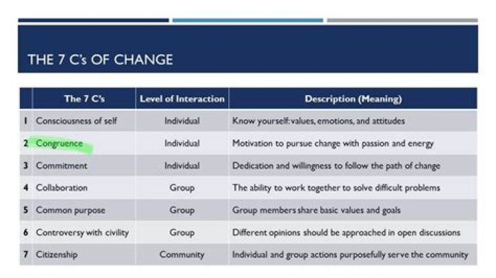 The Social Change Model based on seven dimensions, or values, called the Seven Cs: Consciousness of self, Congruence, Commitment, Common purpose, Controversy with civility, Collaboration, and Citizenship. All seven dimensions work together to accomplish the transcendent “C” of change, each interacting with one another.