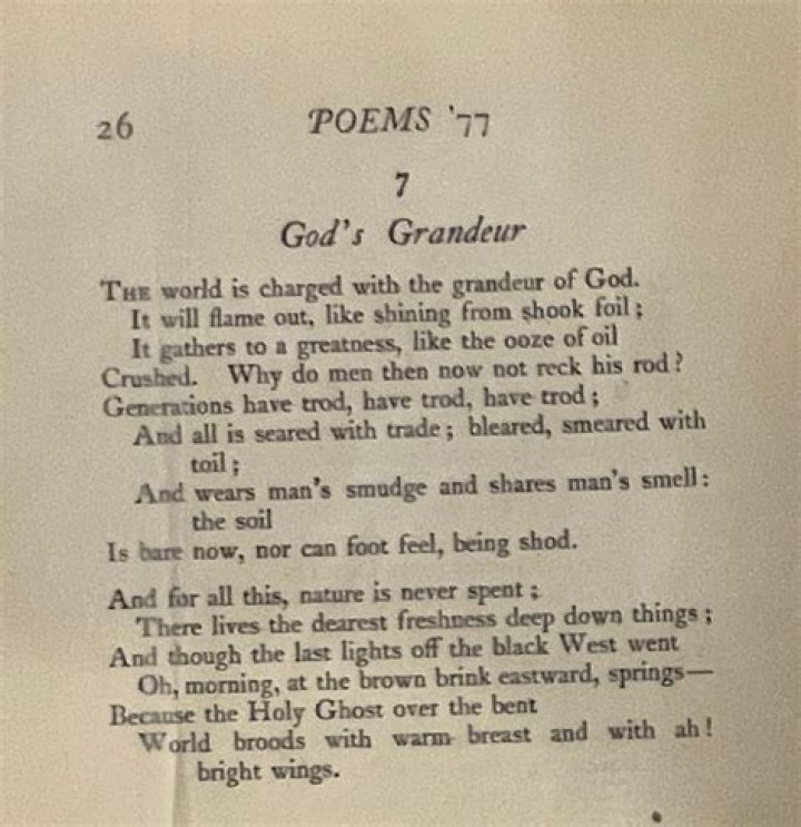 God’s Grandeur is a finely crafted sonnet written in 1877, the year Hopkins was ordained as a Jesuit priest. It explores the relationship between God and the world of nature, how the divine is infused in things and refreshes, despite the efforts of humans to ruin the whole show.