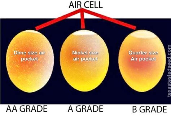 Each USDA grade is a mark of the egg’s quality. Grade AA eggs are the highest quality whereas Grade B are the lowest. Egg graders determine quality based on the egg’s: shell, white, yolk, and air cell. When an egg is first laid it has hardly any air, so the freshest eggs have the smallest air cells.