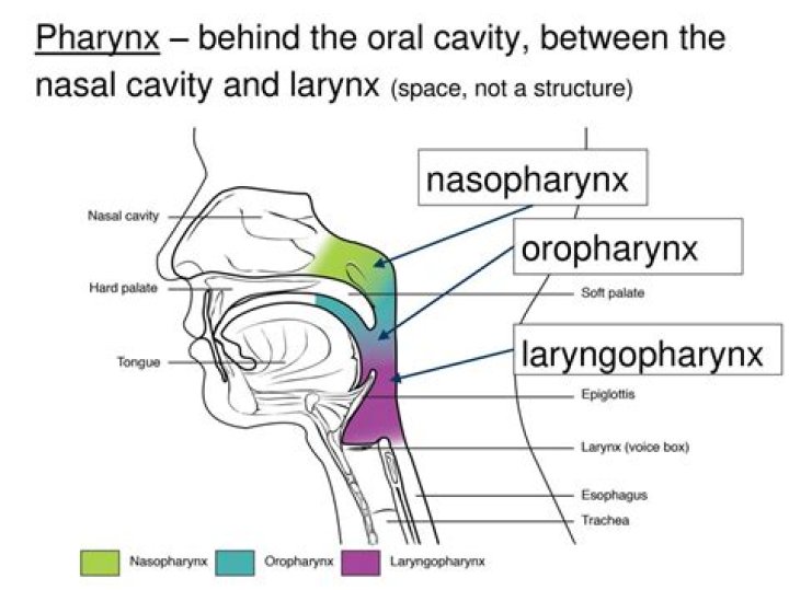 Anatomy of the pharynx (throat). The pharynx is a hollow tube that starts behind the nose, goes down the neck, and ends at the top of the trachea and esophagus. The three parts of the pharynx are the nasopharynx, oropharynx, and hypopharynx.