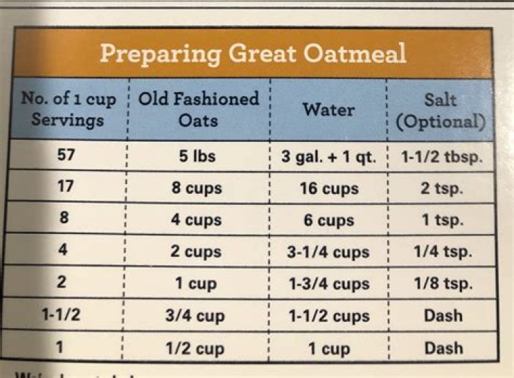 Preparing Great Oatmeal: 1 Serving: 1/2 cup oats; 1 cup water or milk; dash of salt (optional) (For low sodium diets, omit salt.). Heart-Healthy Serving Size: 3/4 cup oats; 1-1/2 cups water or milk; dash of salt (optional) (For low sodium diets, omit salt.).