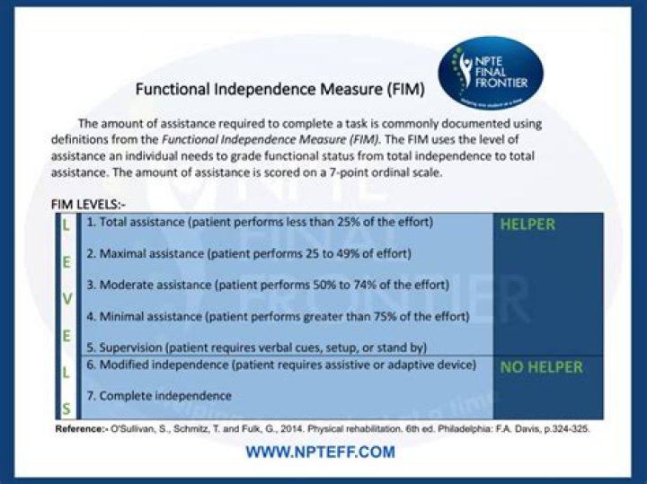 Many rehabilitation facilities use a version of the Functional Independence Measure (FIM). FIM as a standardized way of keeping track, or “score,” of how a patient is or is not improving. The FIM measures progress in activities of daily living, mobility, and communication.