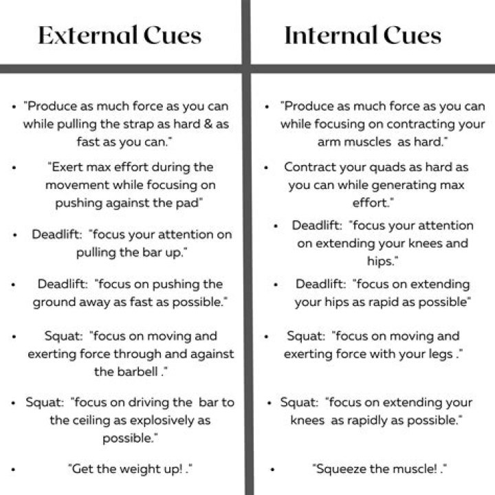 Internal cues direct a client’s attention toward his or her body and the movement process, as it relates to the exercise being performed (Winkelman et al., 2017; Benz et al., 2016; Makaruk et al., 2014; Wulf, 2013; Marchant, 2011; Peh et al., 2011).