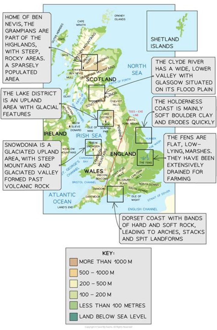 They usually consist of igneous rocks, and experience lower temperatures, high rainfall, and are windy. Lowland areas are not very high above sea level. They are often flat. They tend to be formed of sedimentary rocks like sandstones and clays, and experience milder temperatures and less rainfall.
