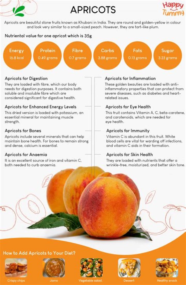 Very nutritious and low in calories. Apricots are very nutritious and contain many essential vitamins and minerals. High in antioxidants. May promote eye health. May boost skin health. May promote gut health. High in potassium.