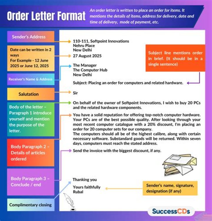 What are the components of an order letter write a sample order letter?