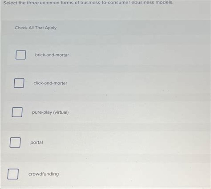 A business that operates only on the Internet without a physical store. What is the ebusiness model that applies to customers offering goods and services to each other over the Internet? Brick-and-click, brick-and-mortar, brick-and-virtual.