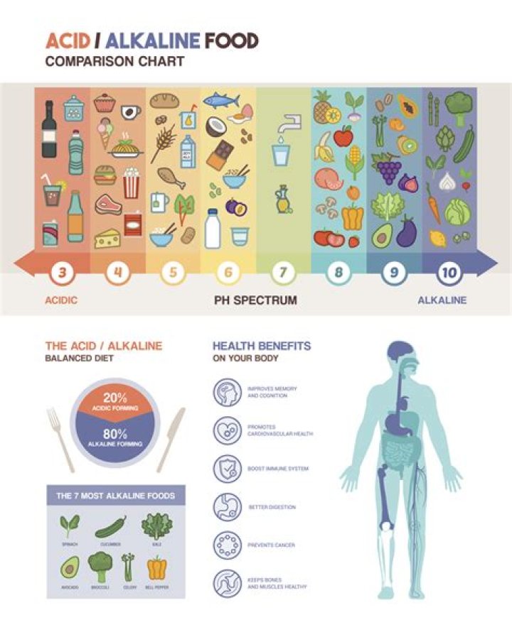 Certain food groups are considered acidic, alkaline, or neutral: Acidic: meat, poultry, fish, dairy, eggs, grains, alcohol. Neutral: natural fats, starches, and sugars. Alkaline: fruits, nuts, legumes, and vegetables.