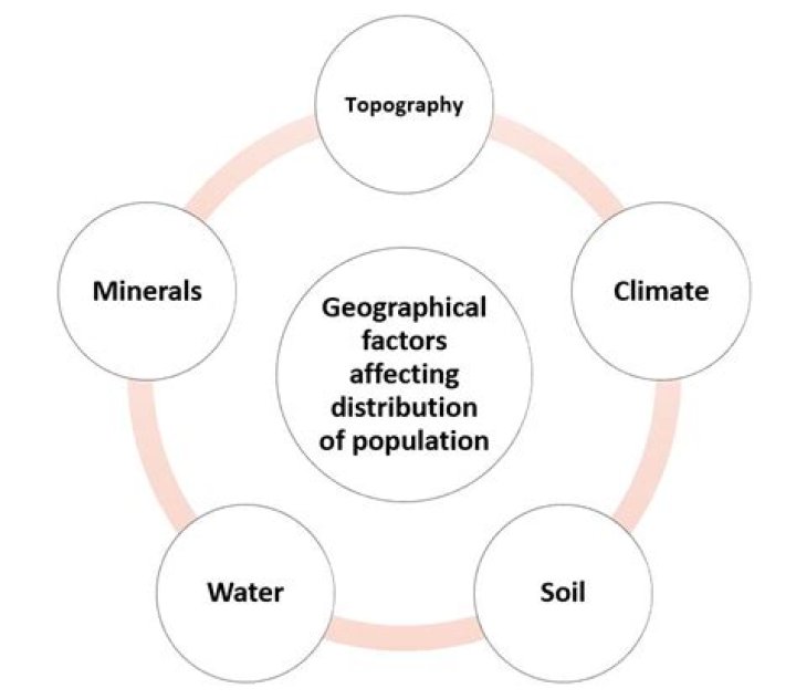The spatial distribution and density of the world’s population reflects a variety of factors. These include the influence of such physical features such as topography, soils, vegetation, climate types, and the availability of resources.