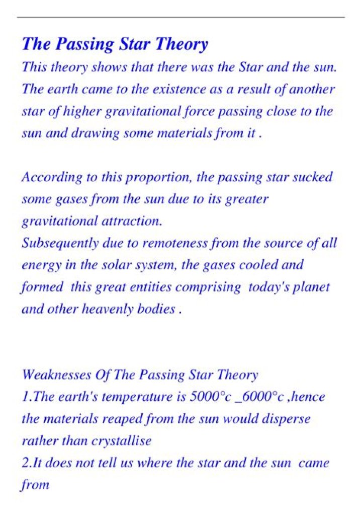 Weakness of the passing star theory are; It fails to explain the original of the sun and the passing star. There are minimal exchange of another star approaching the sun. Materials which were drawn from the sun would have scattered in space rather than condense to form planets.