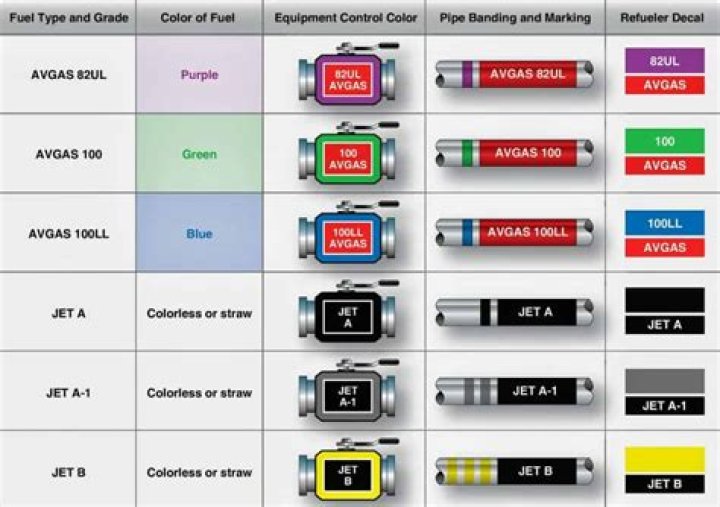 The grade or octane rating of aviation gasoline is identified by colored dyes added to the blend. The colors used in the United States are: Blue: AvGas 100LL (100/130 Octane). This was formulated as a replacement for AvGas 100, with half the lead, thus the name 100LL for Low Lead.