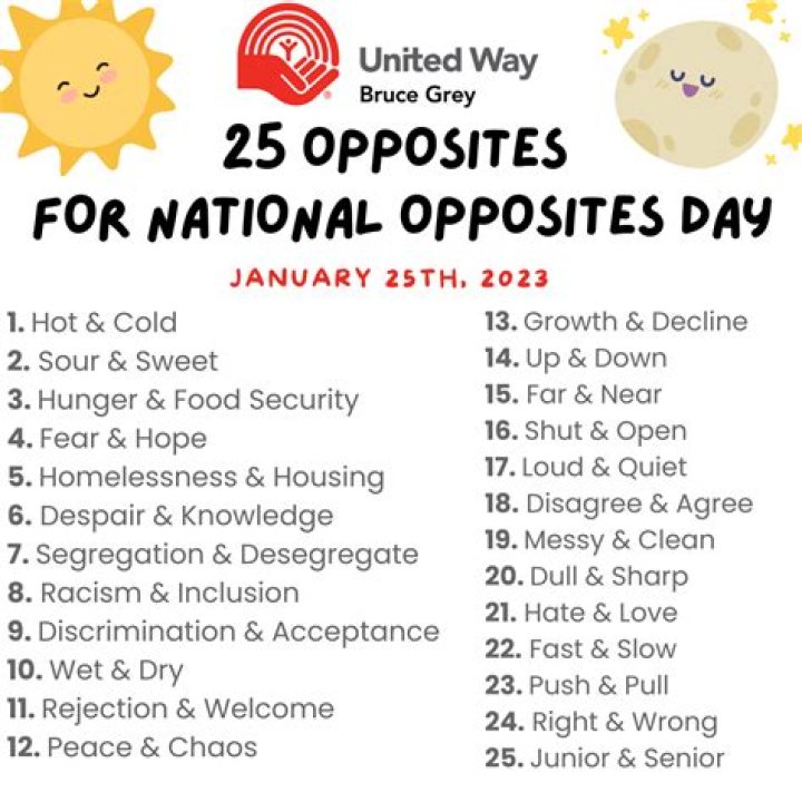 Opposite Day, also known as National Opposite Day, is celebrated on January 25 in the United States. This day began as a children’s game, but anyone can participate on Opposite Day, by saying the opposite of what you actually mean, or by doing things the wrong way around.