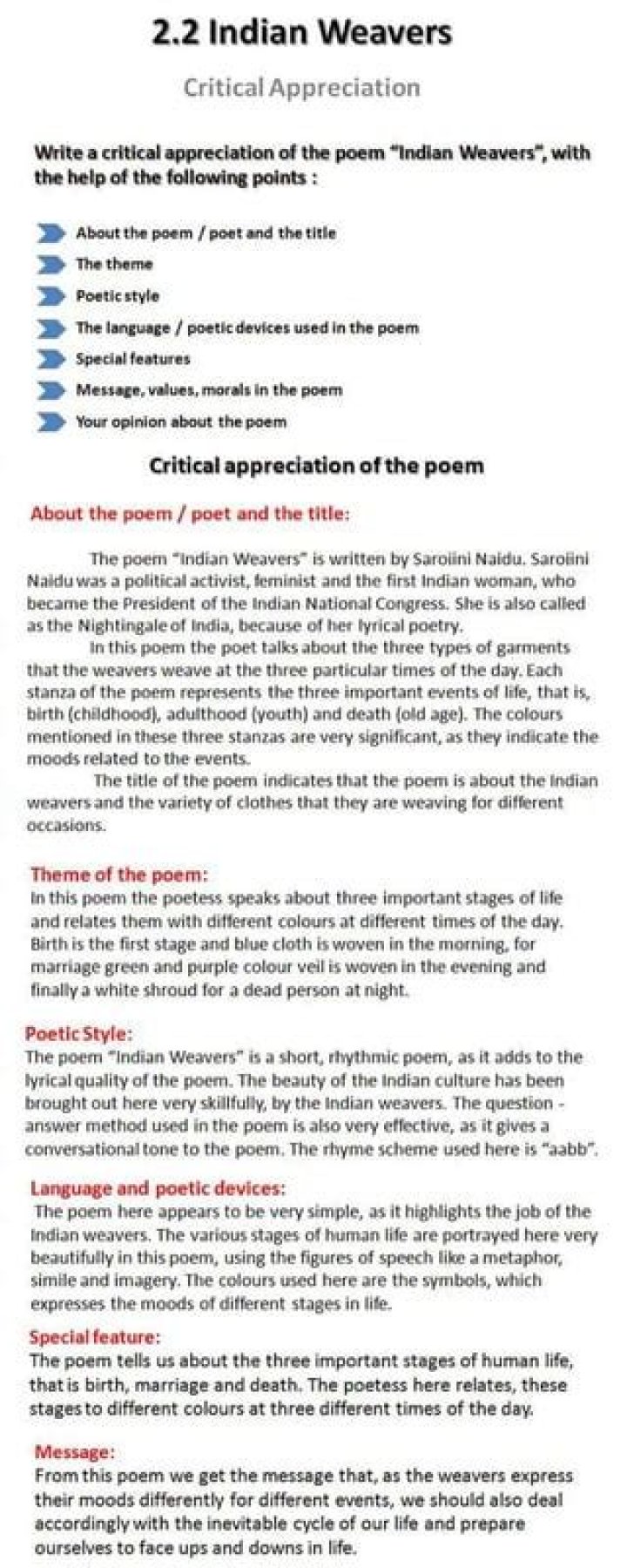 Through the means of the poem the poetess highlights the craft and skill of the weavers. She speaks about the three important stages in a man’s life-birth, marriage and death relates to the different colors and different times of the day.