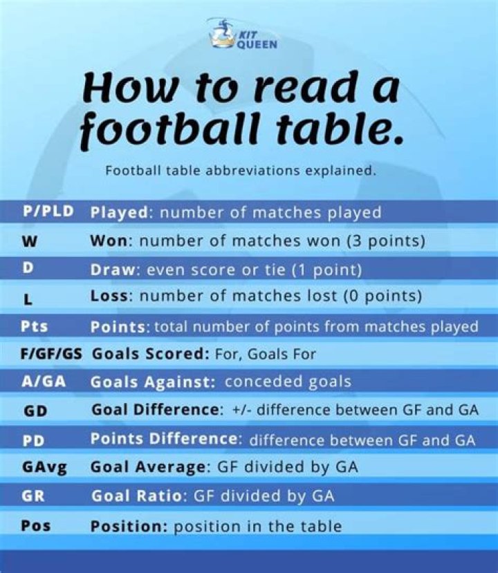 GS – Goals Scored. F, GF – Goals For (sometimes used in place of GS). A, GA – Goals Against (i.e., number of goals conceded by a team). GD – Goal Difference (i.e., difference between GF and GA, and sometimes denoted by +/-).