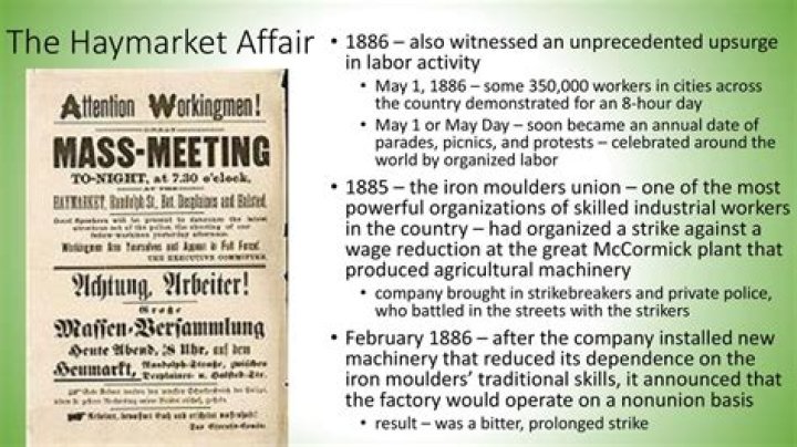 On May 4, 1886, a labor protest rally near Chicago’s Haymarket Square turned into a riot after someone threw a bomb at police. The Haymarket Riot was viewed a setback for the organized labor movement in America, which was fighting for such rights as the eight-hour workday.
