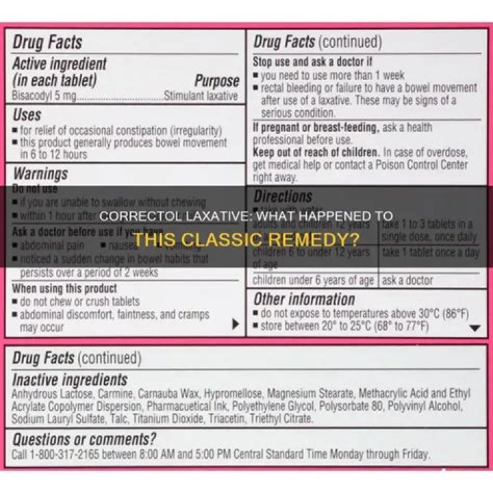 Correctol Laxative is no longer being manufactured for sale in Canada. For brands that may still be available, search under bisacodyl. This article is being kept available for reference purposes only. If you are using this medication, speak with your doctor or pharmacist for information about your treatment options.