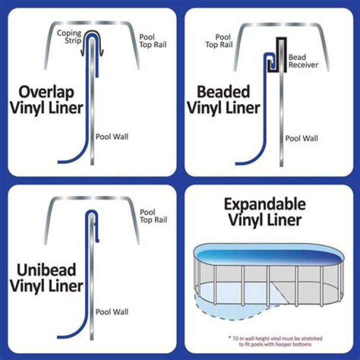 Vinyl liners come in three main types: Overlap, Beaded, and Unibead. The differences between the three of these is how they attach to the wall of the swimming pool.