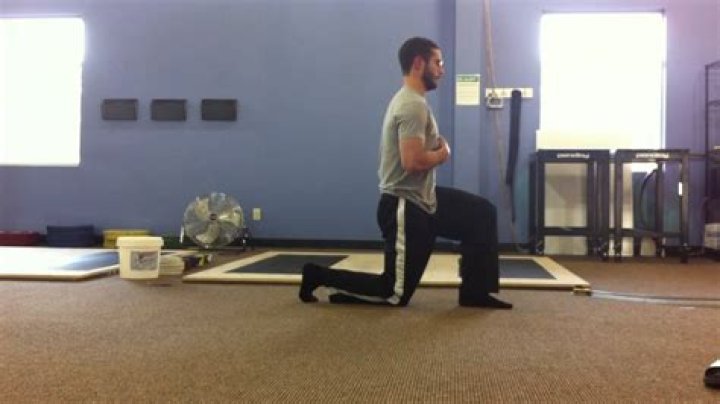 Begin in a half kneeling posture by placing one knee down directly under the hip and the other foot should be in line with the knee, this will create the 90/90 position. Depending on the individual, the width of the front foot can be adjusted for balance.