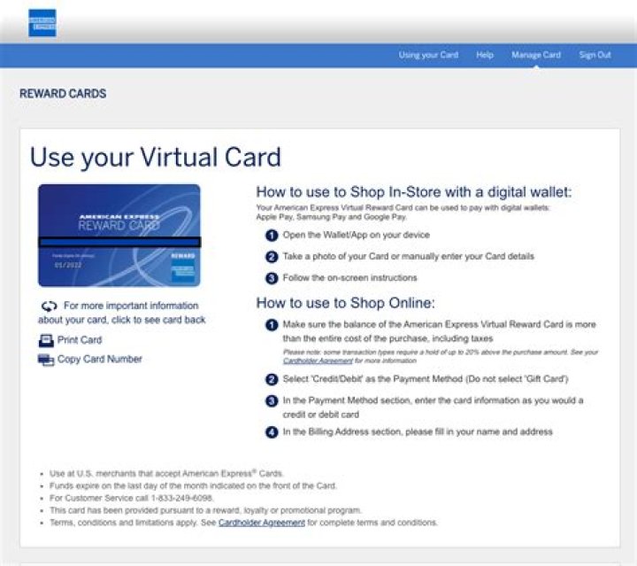 Simply click the link to access your Virtual Visa Reward card, ready for use instantly! Spend it online or add it to your favorite mobile app. All the information you need to use and track your card, including balance and spend history, is available online in one secure, convenient place.
