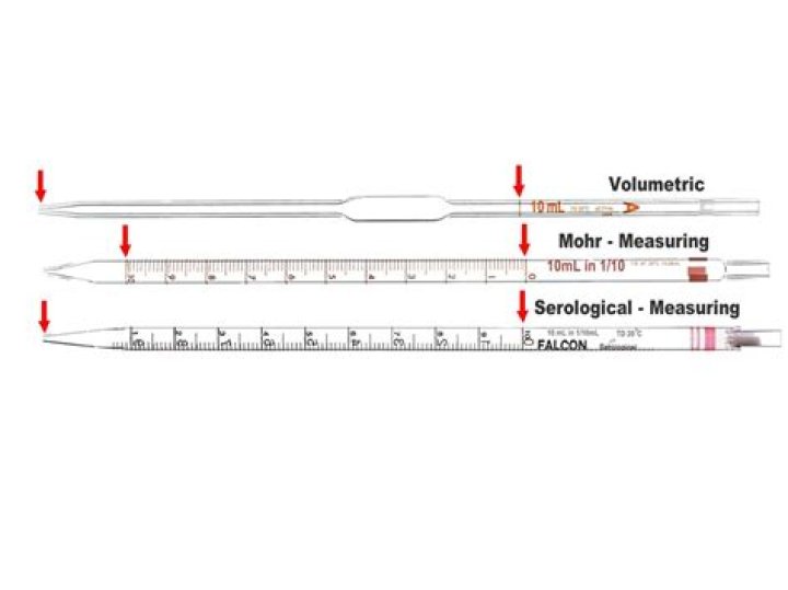 Graduated pipettes (Mohr pipette) have a scale divided into units of one and of 1/10th of a millilitre. Because of their wide necks it is less accurate than the volumetric pipette. They are filled in the same way as volumetric ones and liquid can be gradually released.