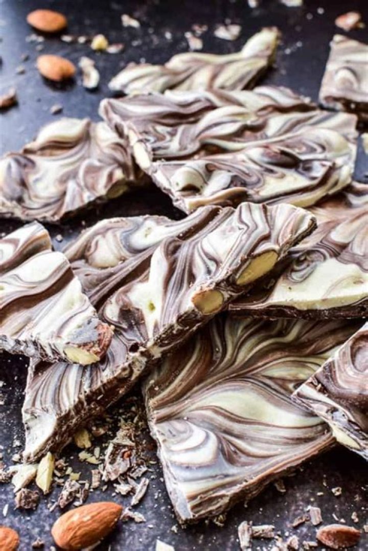 A confection, usually sold by the pound, that consists of slabs of chocolate resembling large pieces of bark and with almonds strewn throughout. Other nut barks exist as well (hazelnut bark, cashew bark etc.) This kind of almond bark can be made with real chocolate or chocolate confectionery coating.