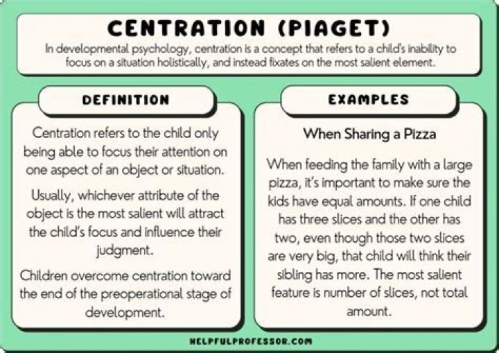 Centration – a child will become completely fixed on one point, not allowing them to see the wider picture. For example, focusing only on the height of the container rather than both the height and width when determining what has the biggest volume.