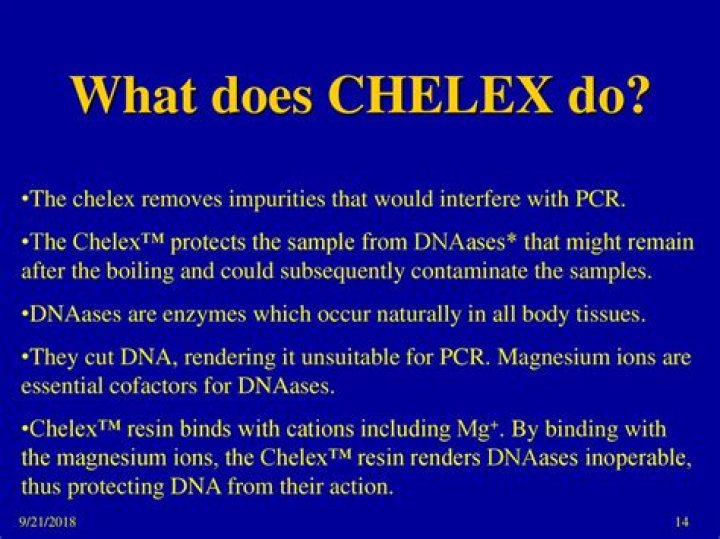 Chelex can chelate a large amount of divalent ions that may be donated by the sample, and the Chelex beads can be easily removed so that they will not interfere with subsequent PCR amplifications that require Mg++.