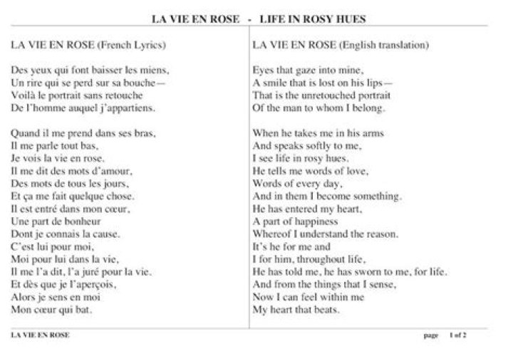 The song’s title can be translated as “Life in happy hues”, “Life seen through rose-colored glasses”, or “Life in rosy hues”; its literal meaning is “Life in Pink.” The lyrics of “La Vie en Rose” were written by Édith Piaf for music composed by Louiguy, and is registered with SACEM.