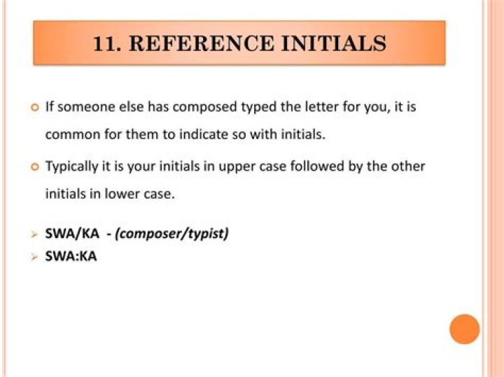 Type the initials of the letter writer in capital letters, followed by a slash or colon. Add the typist’s initials in lowercase letters. For example, if the letter writer’s name is Andrew Benson, and the typist’s name is Carrie Dale, the typist line should appear as follows: AB/cd, or AB:cd.