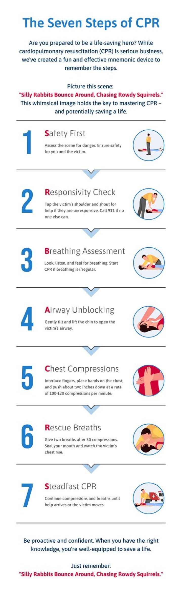 The seven steps of CPR (cardiopulmonary resuscitation) involve checking the scene and the person, calling 911 for assistance, opening the airway, checking for breathing, chest compressions, delivering rescue breaths, and repeating CPR steps.