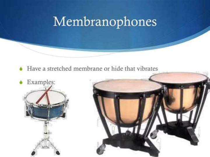 Membranophones are instruments that make sound from the vibrations of stretched skins or membranes. Drums, tambourines, and some gongs are common examples of membranophones.