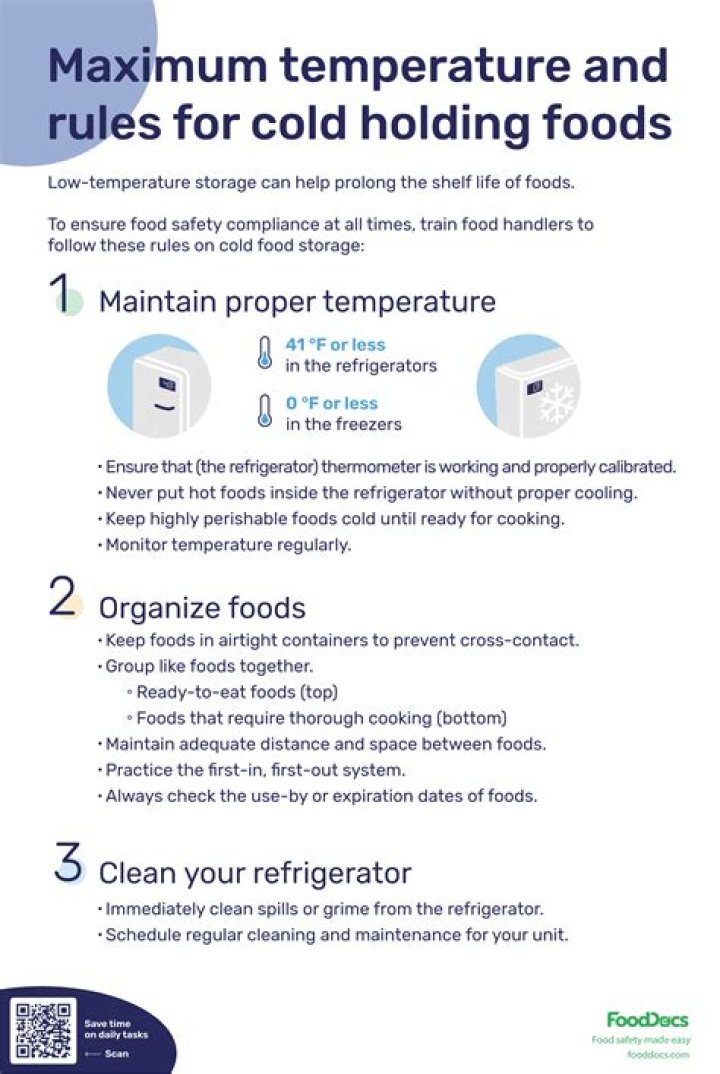FACT: All cold foods must be maintained at 41藲F or below while being held for service. cold holding units. Check the temperature of these devices by keeping a thermometer inside of the unit. For cold reading, check the warmest section of the unit; for hot reading, check the coolest section of the unit.