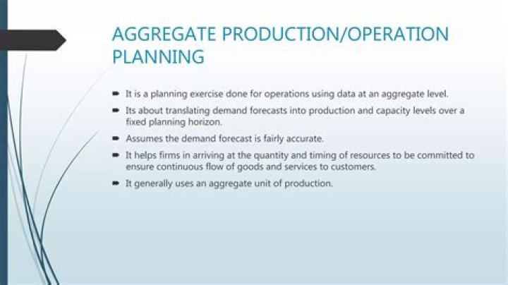 Aggregate planning is medium-range capacity planning which typically covers a time horizon of anywhere from three to 18 months. The goal of aggregate planning is to achieve a production plan which will effectively utilize the organization’s resources to satisfy expected demand.