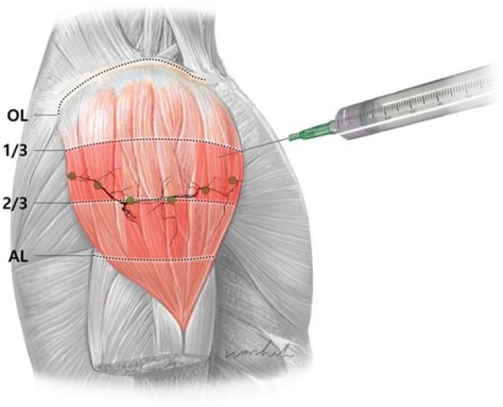 Typically, people who need to self-administer injections use the vastus lateralis muscle in the thigh. To locate the correct spot, imagine dividing the thigh vertically into three equal parts. Give the injection into the outer top part of the middle section.