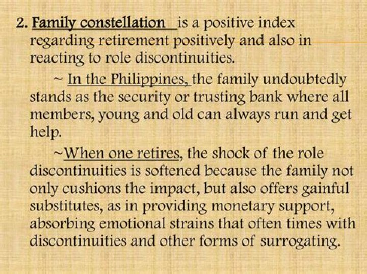 * Sister Letty G. In Kuan’s theory of retirement and role discontinuities, she values the effect of retirement as a phase of one’s life and its accompanying adjustments. … She identified the determinants of positive perceptions in retirement and positive reactions toward role discontinuities.
