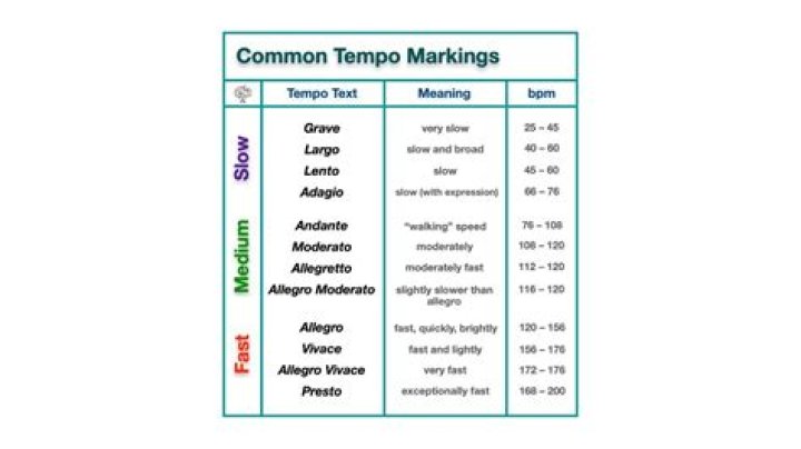 Largo—the most commonly indicated “slow” tempo (40–60 BPM) Larghetto—rather broadly, and still quite slow (60–66 BPM) Adagio—another popular slow tempo, which translates to mean “at ease” (66–76 BPM)