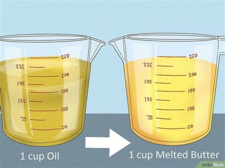 Use the same quantity specified in the directions (for example, if it calls for 1/3 cup of oil, use 5 1/3 tablespoons of butter). Melt it down, then let it cool a bit.