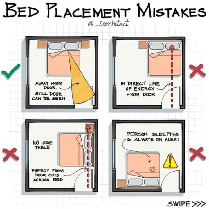 Positioning your bed in line with the door is the worst possible position, according to the principles of Feng shui. People who practice Feng shui call it the ‘dead man’s position’ or the ‘coffin position’ because the feet or head face the door and resemble how we carry the dead through open doors from the house.