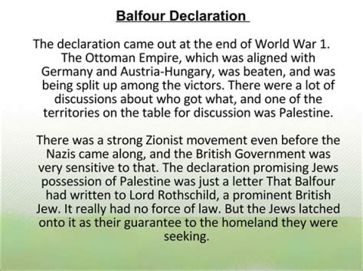 Balfour Declaration, (November 2, 1917), statement of British support for “the establishment in Palestine of a national home for the Jewish people.” It was made in a letter from Arthur James Balfour, the British foreign secretary, to Lionel Walter Rothschild, 2nd Baron Rothschild (of Tring), a leader of the Anglo-