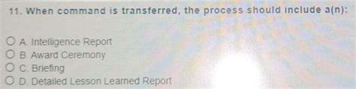 1 Answer. Explanation: When command is transferred, the process must include a briefing that captures all, but initialy must rely on letting all personnel aware of the exact time of the beginning of the new leadership so there are no misunderstandings on the chain of command.