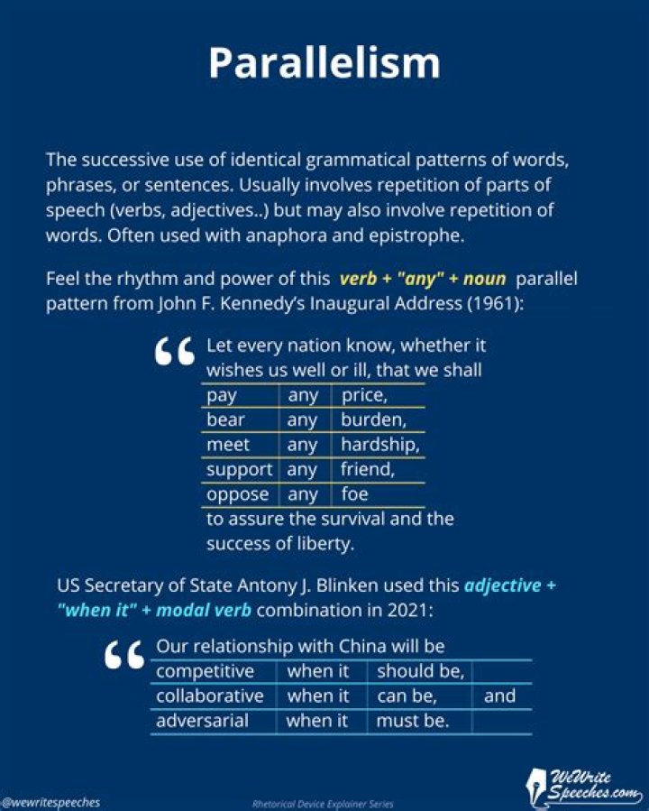 Parallelism can add pleasing rhythm to speech that makes it seem more eloquent, can help to highlight or emphasize ideas, and through its use of repetition can make a speech more persuasive.