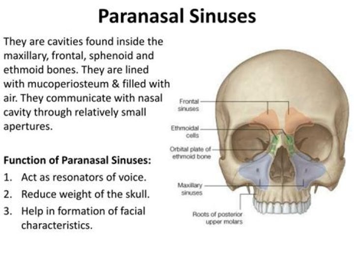 Paranasal sinuses are named after the bones that contain them: frontal (the lower forehead), maxillary (cheekbones), ethmoid (beside the upper nose), and sphenoid (behind the nose).