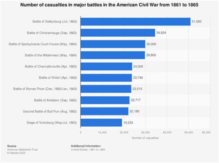 Number of casualties in major battles in the American Civil War 1861-1865. Of the ten bloodiest battles of the American Civil War, the Battle of Gettysburg in early July, 1863, was by far the most devastating battle of the war, claiming over 51 thousand casualties, of which 7 thousand were battle deaths.