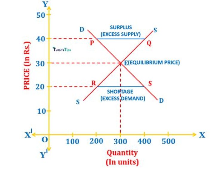 On a graph, the point where the supply curve (S) and the demand curve (D) intersect is the equilibrium.