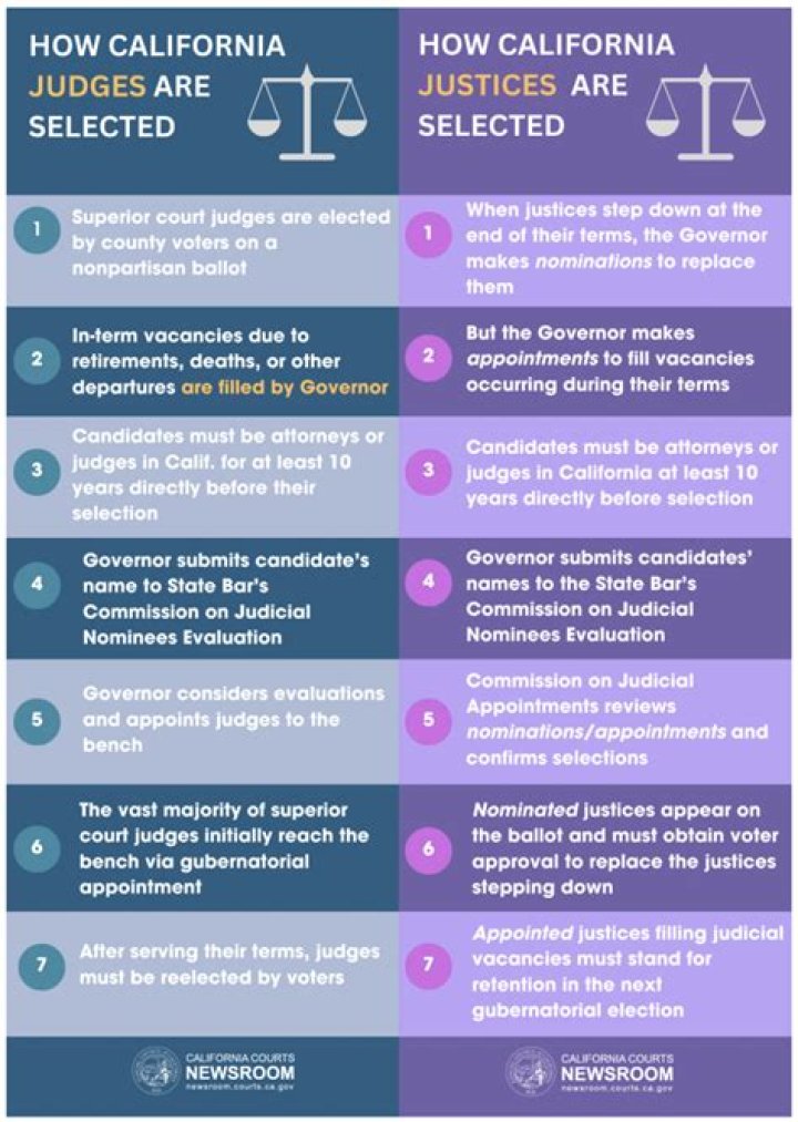 The California Legislature determines the number of judges in each court. Superior court judges serve six-year terms and are elected by county voters on a nonpartisan ballot at a general election. Vacancies are filled through appointment by the Governor.