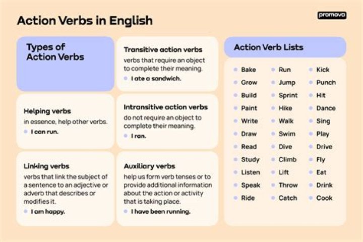 What are ACTION verbs? An action verb is a verb that describes an action, like run, jump, kick, eat, break, cry, smile, or think.