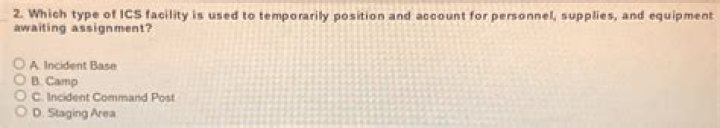 Staging Areas – temporarily position and account for personnel, supplies, and equipment awaiting assignment.