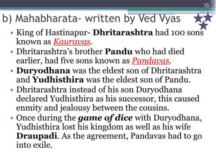 He was born to Vichitravirya’s first wife Ambika. Dhritarashtra was born blind. He fathered one hundred sons and one daughter, Dushala, by his wife, Gandhari and a son, Yuyutsu, by his wife’s maid.