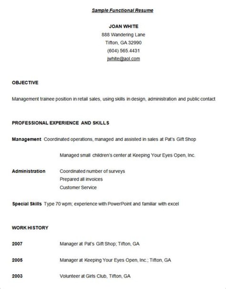Functional: College students may be drawn to functional resume formats, which emphasize skills and abilities and downplay chronological work history. Skills are typically provided without context, making the content hard to follow. Functional resumes don’t play nicely with applicant tracking systems.