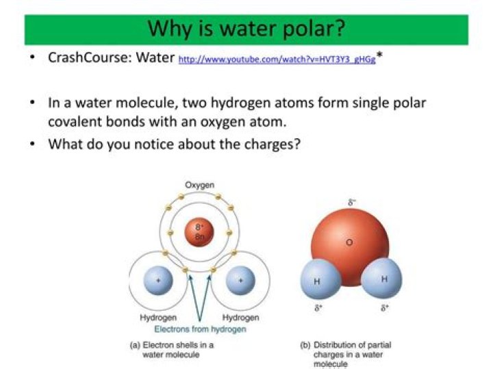 Water (H2O) is a polar molecule because the electrons of the hydrogen atoms get “pulled” towards the electrons of the oxygen atom. This makes a region of positive charge on the hydrogen atoms and the negative charge on the other end of the molecule, which is the oxygen atom. This also allows for hydrogen bonding.
